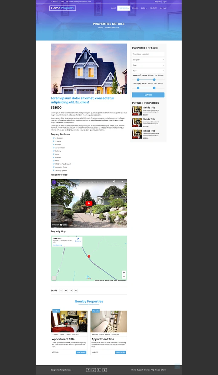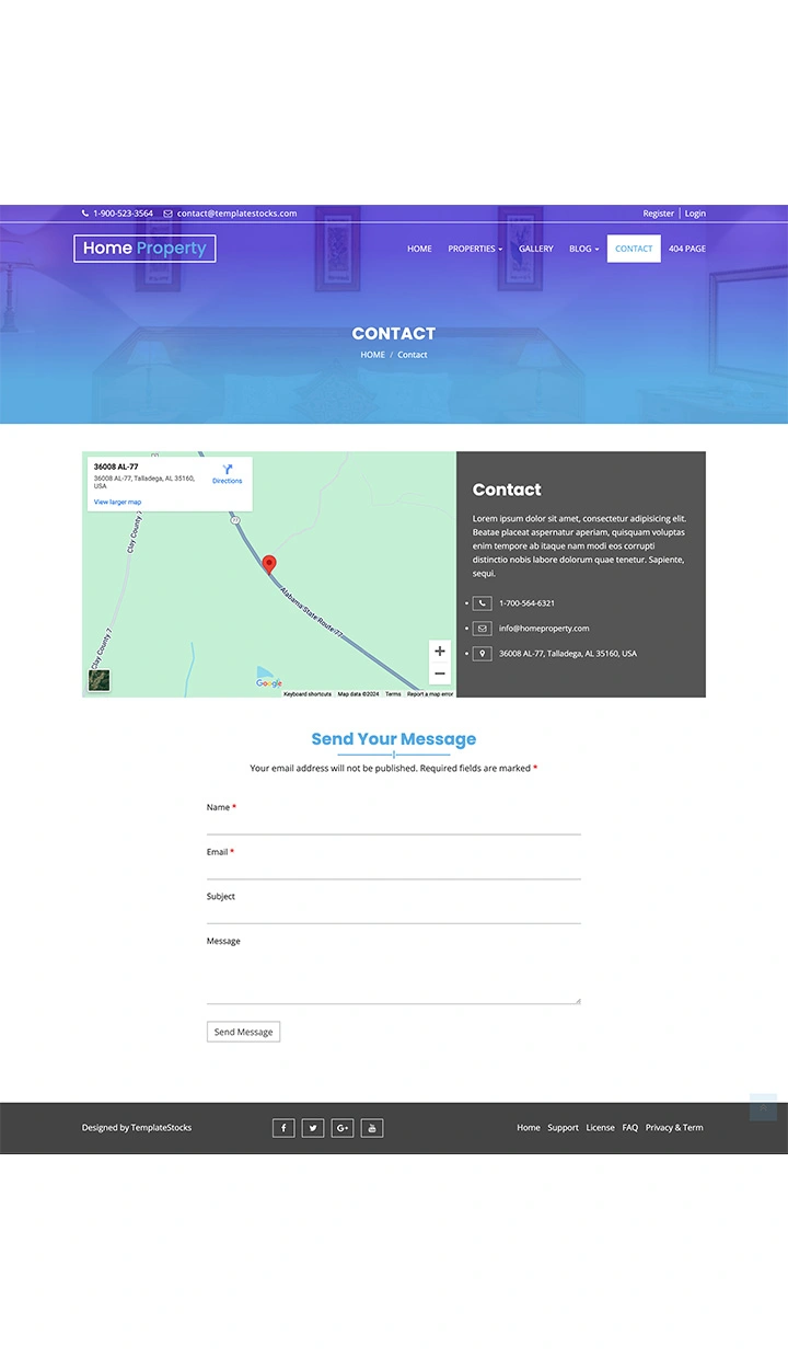 A contact form with Google Maps is implemented to let your clients contact you easily. It was built for real estate companies and property listing agents needed features in mind.